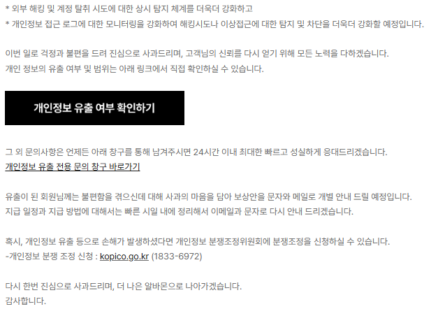알바몬은 해킹 시도를 조기에 인지하고, 공격에 사용된 계정 및 IP를 즉시 차단하는 등의 긴급 대응을 실시했습니다. 또한, 해당 보안 취약점에 대해 즉시 기술적 조치를 취하고 시스템 점검을 완료했습니다. 이런 초기 대응은 추가적인 유출 피해를 막는 데 중요한 역할을 했다고 할 수 있습니다.