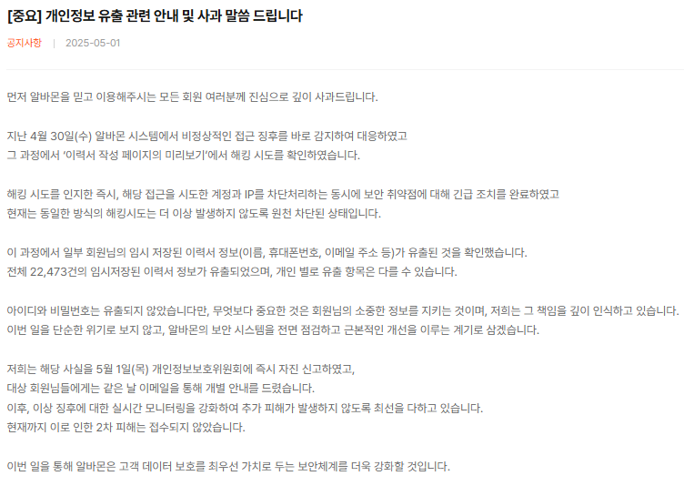보다 정확한 정보와 대응 방안은 알바몬 공식 홈페이지의 공지사항을 통해 확인하는 것이 가장 좋습니다. 알바몬은 향후 모든 진행 사항을 공식 채널을 통해 공지할 계획이므로, 피해자 및 관심 있는 이용자들은 수시로 공지사항을 확인해 불이익을 방지하시기 바랍니다.